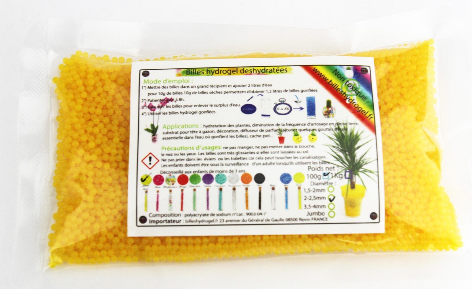 Toutes nos billes hydrogel sont vendues déshydratées. 10 grammes de billes deshydratées permettent d'obtenir environ 1,3 litres de billes gonflées !
