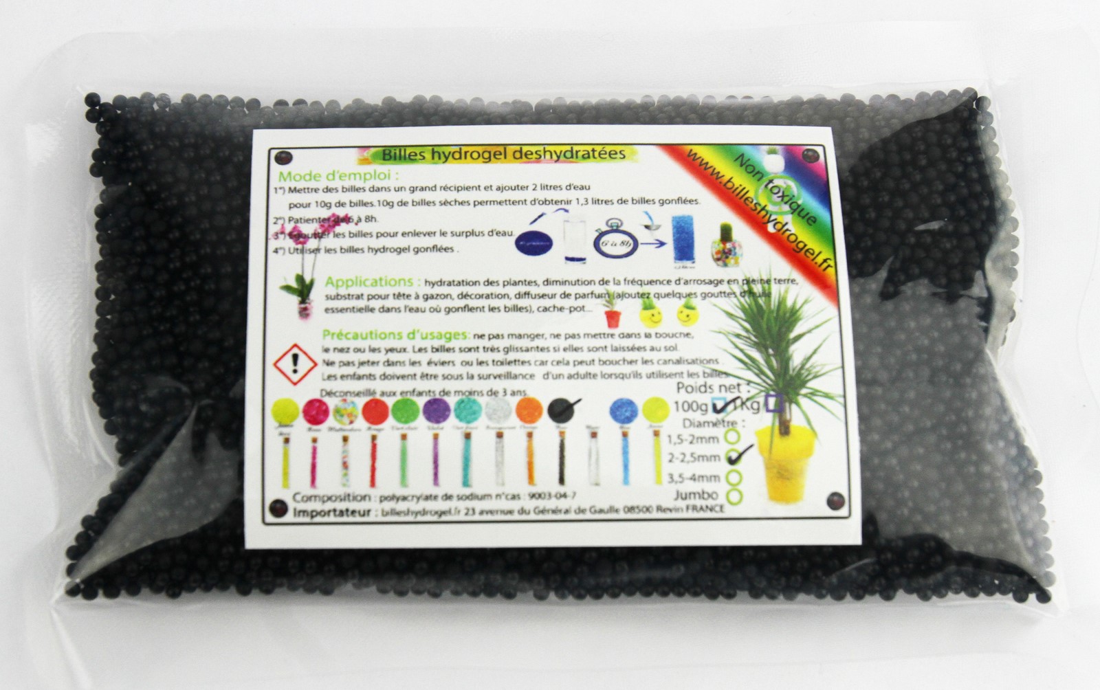 Toutes nos billes hydrogel sont vendues déshydratées. 10 grammes de billes deshydratées permettent d'obtenir environ 1,3 litres de billes gonflées !