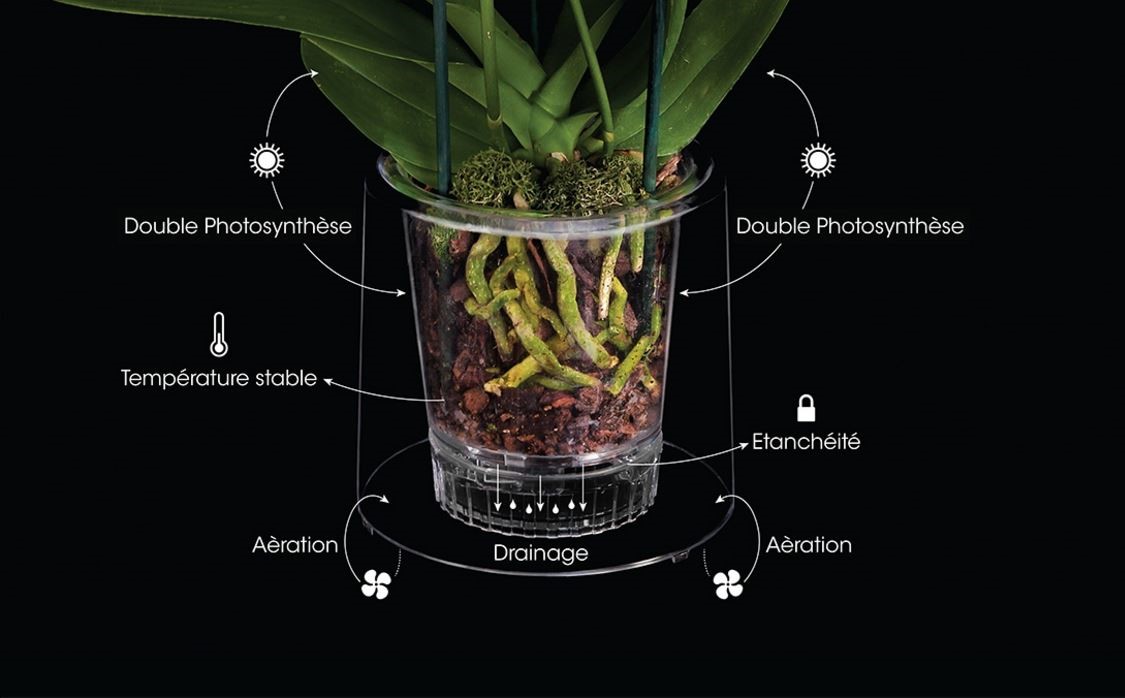 Ce pot fabriqué par MASGABANA est spécialement conçu pour les orchidées mais aussi pour les plantes d’intérieur. Design réalisé par : D. Ramon Benedito, designer reconnu et détenteur de nombreux prix internationaux. Le système novateur de ce pot est de permettre une aération optimale de la racine !